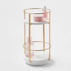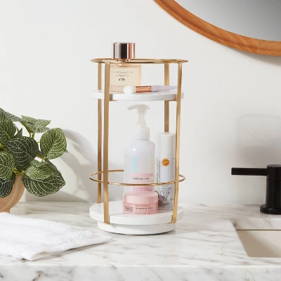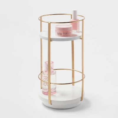 Organize and decorate your home in luxurious style with the Round Metal Countertop Turntable from Brightroom™. Set on a metal frame, this round storage cart features two shelves for easy organization of your bath accessories, makeup essentials and more. The gold-tone frame complements the white shelves for an eye-catching look. Simply place this metal-frame cart on a tabletop or vanity counter to keep your space organized.
