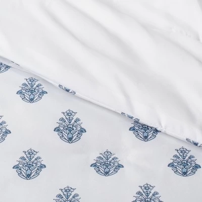 - White comforter set adorned with a floral block print in blue shades