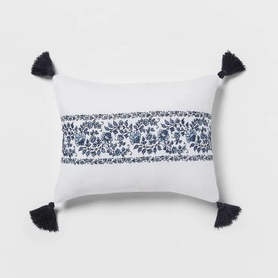 Bring a refreshing and soothing look to your bedroom with the Norwood Block-Print with Border Comforter Bedding Set from Threshold™. The white comforter is adorned with an allover floral block print in blue shades, and is framed by a coordinating border for an appealing touch to liven up your room instantly. The set includes a square and a rectangular decorative pillow with stripes or a border design, as well as a matching pillow sham, that coordinate with the top of the bed for a cohesive look. This comforter bedding set features a year-round fabric construction for comfortable use. Pair it with white bedsheets to enhance the fresh and clean look, and toss in throw pillows in coordinating colors and patterns to finish a lovely setting.