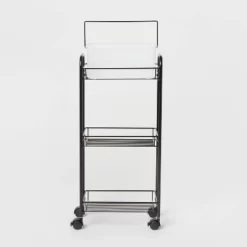 Keep your bath essentials organized in simple style by using the Bathroom Storage Cart from Room Essentials™. Designed with a mix of metal and plastic, this black storage cart features wired shelves to nicely hold bath towels, storage boxes and other items. This sleek storage cart comes with castor wheels for easy movement anywhere around your home.