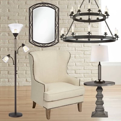 - Torcherie floor lamp from the Franklin Iron Works brand. Top light offers general room lighting. Adjustable gooseneck arms on the side lights allow you to direct light for reading or other tasks.
